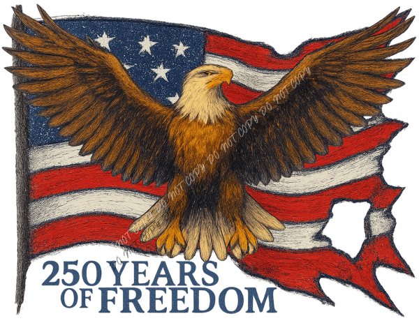 The 250 Years of Freedom Eagle DTF Transfer features a powerful bald eagle with wings fully spread, layered over a weathered American flag backdrop. The hand-drawn, textured style gives this design a bold vintage feel that captures strength, resilience, and national pride.