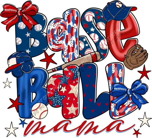 Cheer loud and proud with this bold “Baseball Mama” design featuring red, white, and blue patterns, bows, stars, and classic baseball details. From bats and gloves to caps and patriotic prints, this graphic brings game day spirit and American pride together in one standout design.