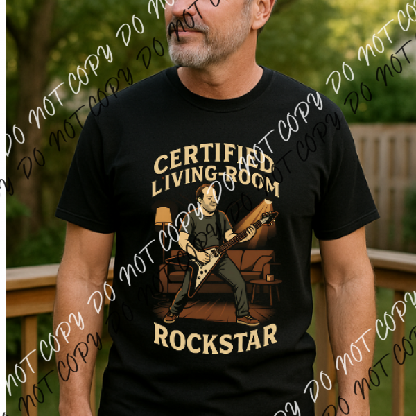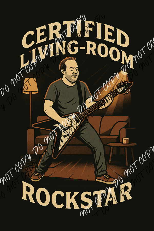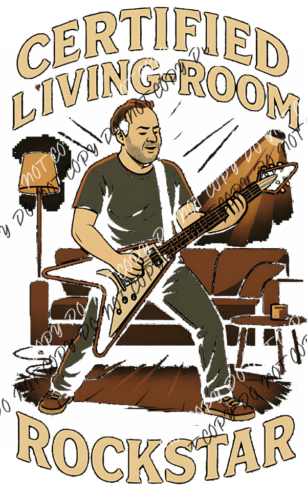 Turn everyday jam sessions into legendary moments with the Certified Living Room Rockstar DTF Transfer. This vintage-inspired design features a confident guitarist shredding on a flying V guitar in a cozy living room setting, paired with bold, distressed lettering that gives it a classic rock vibe.