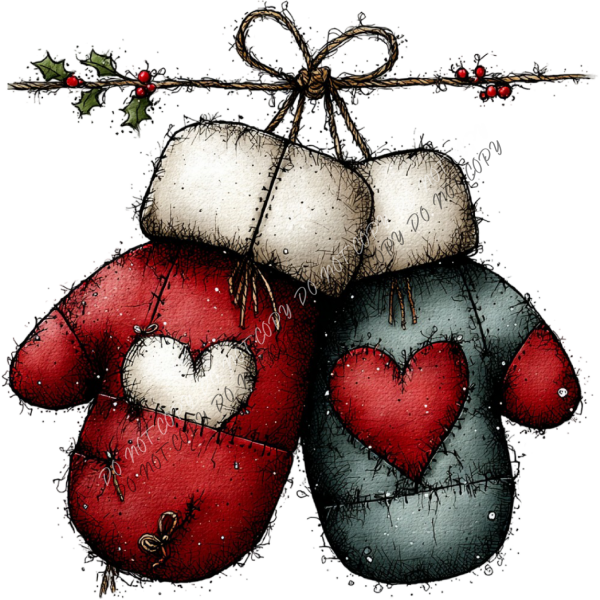 Warm up your winter wardrobe with our Country Christmas Mittens DTF Transfer. Featuring two cozy, hand-stitched mittens—one red and one teal—decorated with rustic hearts and tied together with twine and holly, this design brings farmhouse charm to your holiday apparel.
