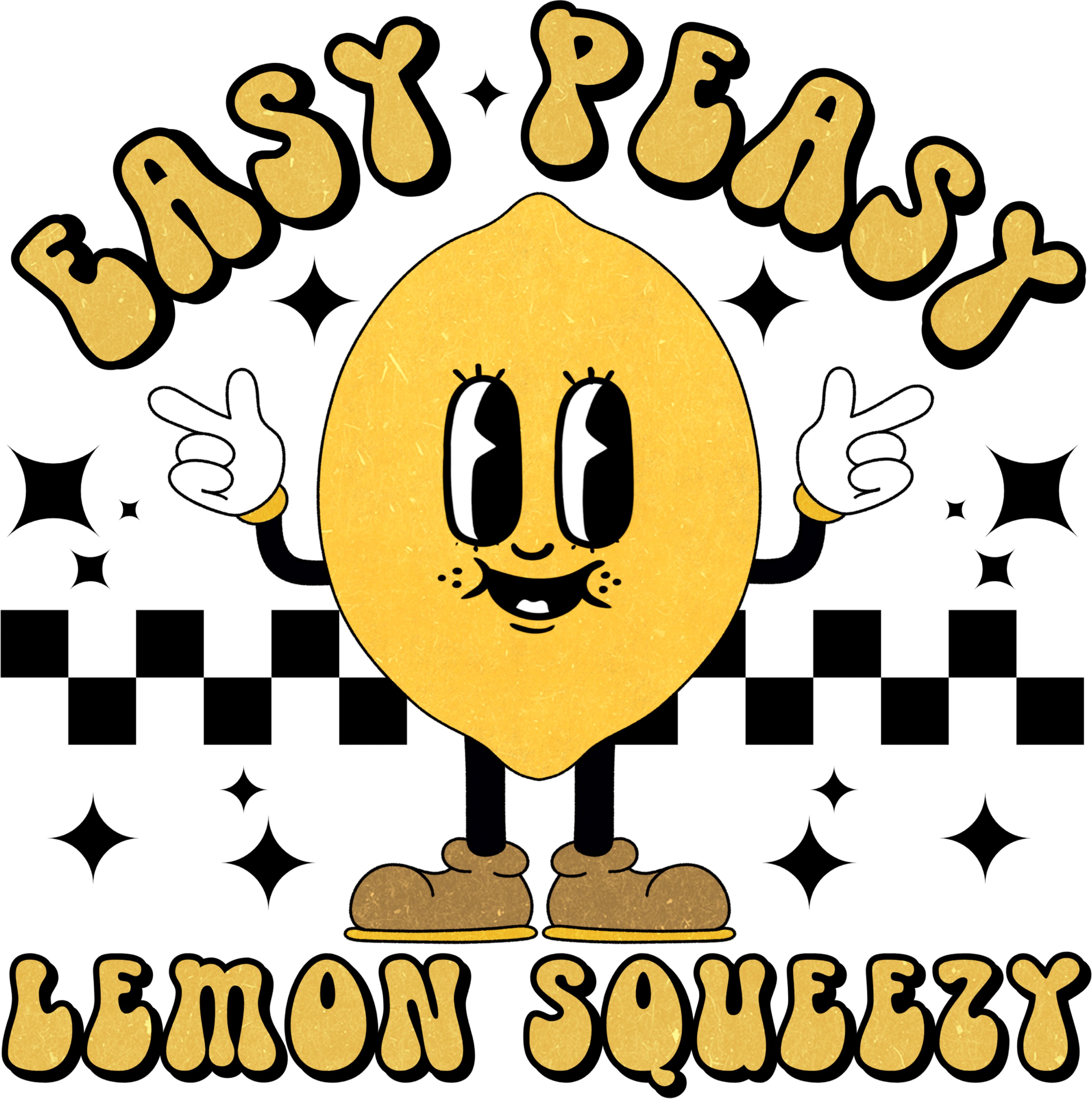 - Playful Retro Design: A cute lemon character paired with bold “Easy Peasy Lemon Squeezy” lettering for a fun statement.