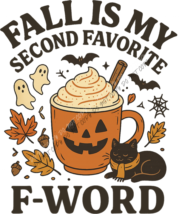 Celebrate autumn with humor and cozy vibes with our Fall Is My Second Favorite F-Word DTF Transfer. This playful design features a pumpkin spice latte in a jack-o’-lantern mug, surrounded by fall leaves, bats, ghosts, and a cute black cat—perfect for anyone who loves a mix of spooky, sassy, and seasonal style.