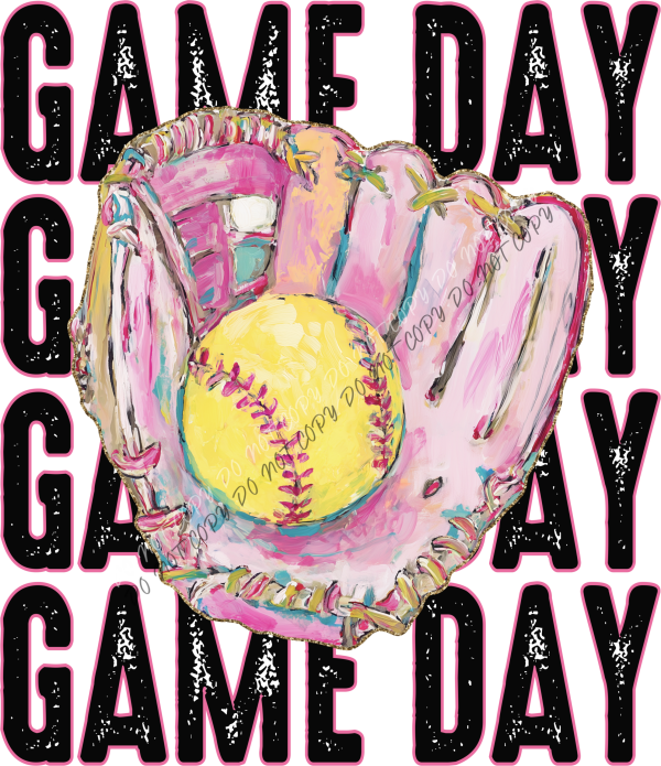 This vibrant Game Day softball design features a hand-painted style softball nestled inside a colorful catcher’s glove, layered over bold Game Day lettering. The textured brushstroke details, bright pinks, yellows, and soft pastels create a fun, eye-catching look that stands out on any apparel.