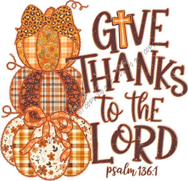 Celebrate gratitude and faith with our Give Thanks to the Lord Patchwork Pumpkins DTF Transfer. Featuring stacked pumpkins in fall plaids, florals, and leopard prints, this cozy autumn design includes a glowing cross and the verse reference Psalm 136:1 — “Give thanks to the Lord, for He is good.”