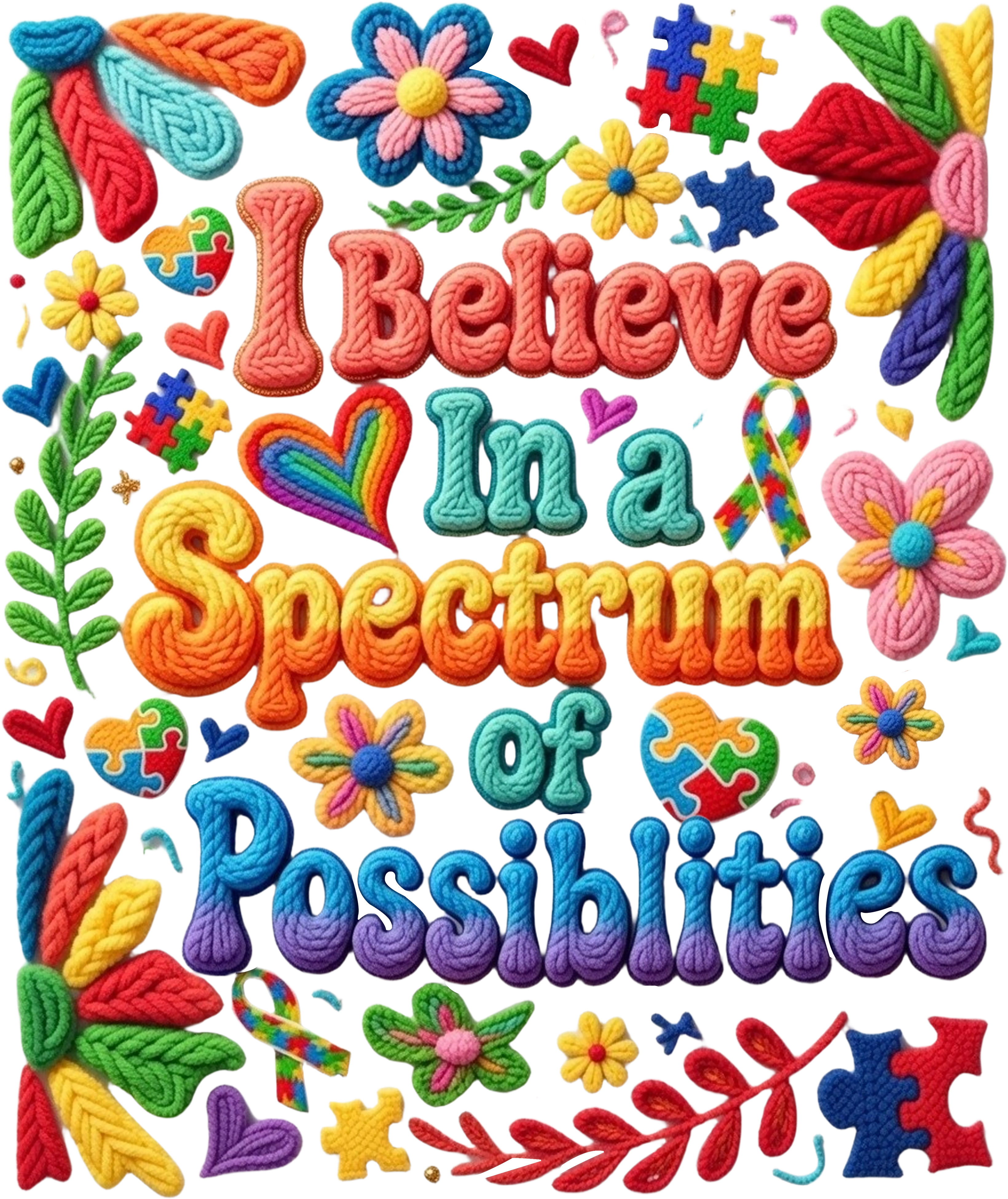 Bright, meaningful, and full of heart, our I Believe in a Spectrum of Possibilities DTF Transfer is a powerful design that celebrates neurodiversity and inclusion. Featuring vibrant yarn-inspired lettering, rainbow accents, puzzle pieces, florals, and awareness ribbons, this design makes a bold and beautiful statement of support.