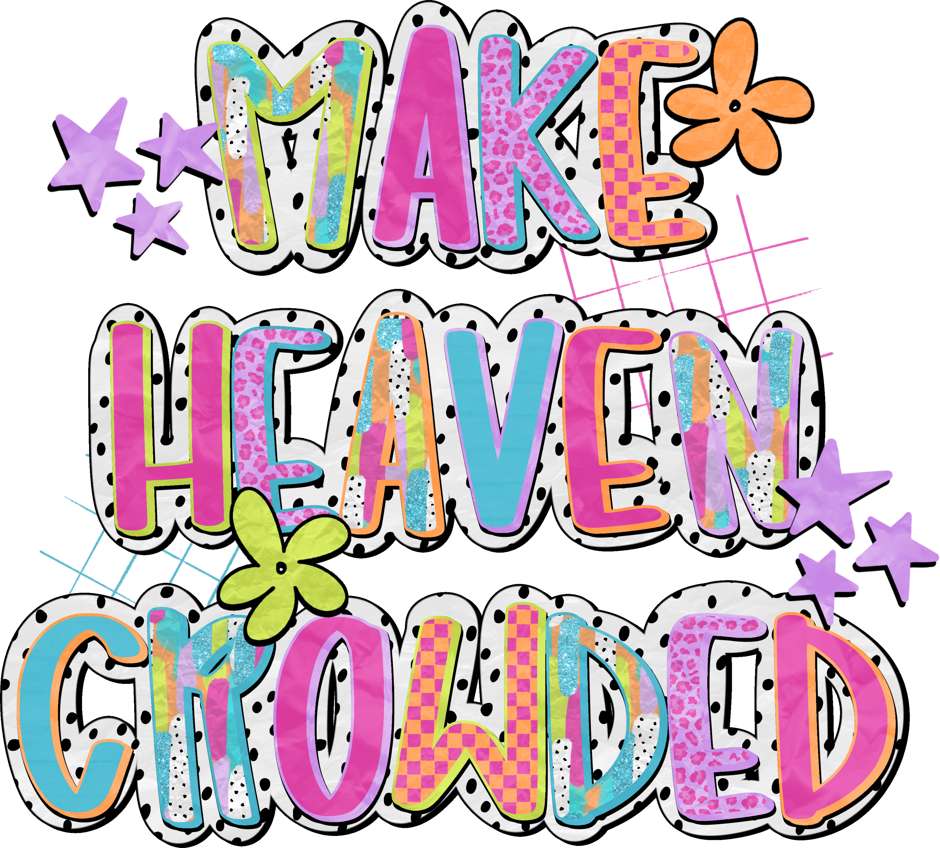 Share your faith with bold color and energy using our Make Heaven Crowded FAUX Neon Patchwork DTF Transfer. This vibrant design features playful mixed-pattern lettering filled with bright neon colors, polka dots, checkerboard accents, and fun star and flower details. The uplifting message paired with the colorful boutique-style artwork creates a trendy statement piece perfect for faith-based apparel.