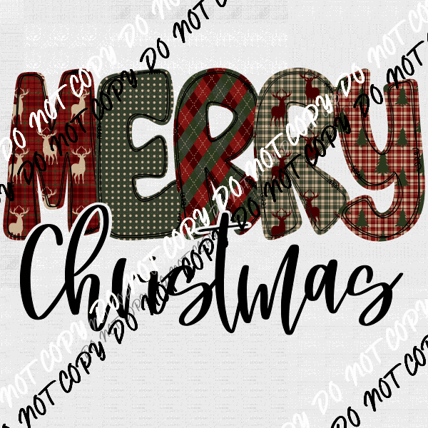 Merry Christmas Deer Plaid Text with Black DTF Transfer