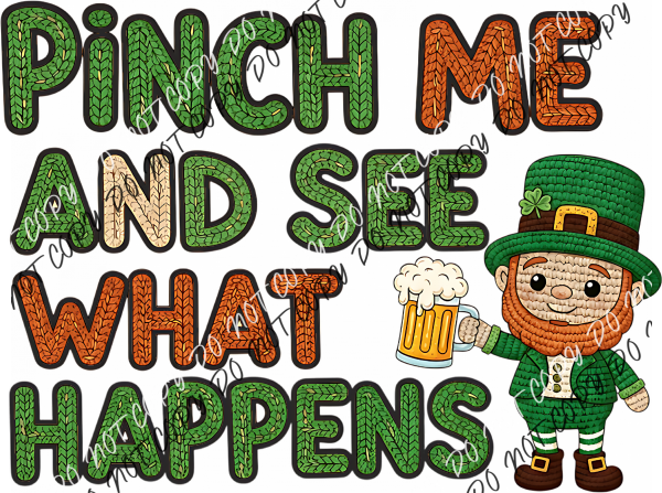 Get ready to turn heads this St. Patrick’s Day with our Pinch Me And See What Happens DTF Transfer. Featuring a playful leprechaun holding a frothy mug of beer and bold knit-textured lettering in festive greens and oranges, this design is perfect for anyone who loves to mix humor with holiday spirit!