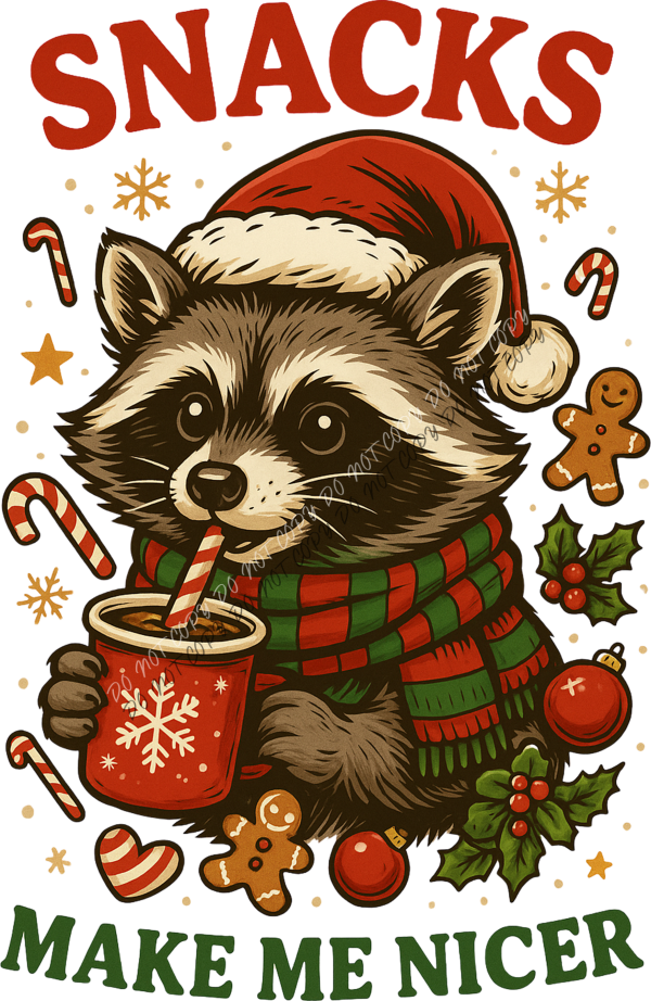 Show off your love for snacks and holiday fun with the Snacks Make Me Nicer Raccoon DTF Transfer — because everything’s better with a treat!