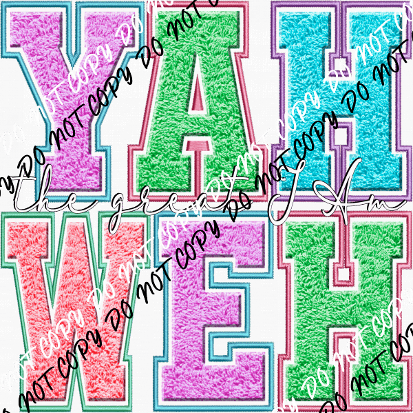 Show your faith with style using our Yahweh Faux Chenille DTF Transfer. Featuring bold, colorful faux chenille lettering with a script overlay that reads "the great I Am," this design brings a trendy yet meaningful touch to your custom apparel.